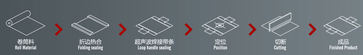 2.本機(jī)通過折邊后,再經(jīng)過左右兩臺(tái)燙把機(jī)把雙手提條焊好,裁切出來(lái)。